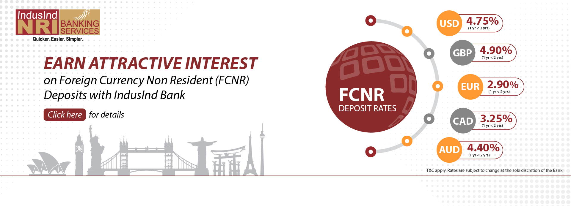 FCNR Deposit allows you to hold your overseas earnings in foreign currency without converting them into Indian Rupees and protect it from exchange rate risk.