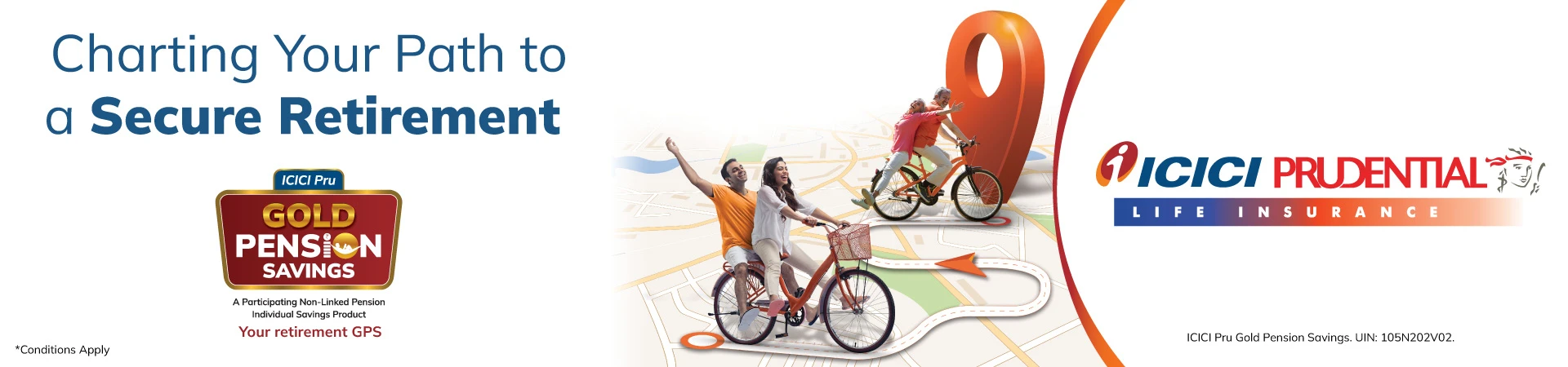 © ICICI Prudential Life Insurance Co. Ltd. All rights reserved. Registered with Insurance Regulatory & Development Authority of India (IRDAI) as Life Insurance Company. Regn. No. 105. CIN: L66010MH2000PLC127837. Reg. Off.: ICICI PruLife Towers, 1089 Appasaheb Marathe Marg, Prabhadevi, Mumbai 400025. Tel.: 40391600. Customer helpline number - 1800 2660. Timings – 10:00 A.M. to 7:00 P.M., Monday to Saturday (except national holidays). Member of the Life Insurance Council. For more details on the risk factors, term and conditions please read the product brochure carefully before concluding the sale. Trade Logo displayed above belongs to ICICI Bank Ltd & Prudential IP services Ltd and used by ICICI Prudential Life Insurance Company Ltd under license. ICICI Pru Gold Pension Savings. UIN: 105N202V02. Advt: W/II/1335/2025-26